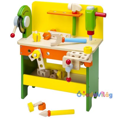 Fa játék munkapad köszörűvel (M) barkácsasztal, mely a gyermekek egyik nagy kedvence! A fából készült barkácsasztal oly sok mindent relyteget magában! A gyermekek csavarozhatnak, fűrészelhetnek és kalapálhatnak rajta!