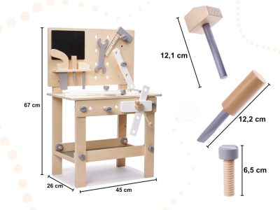 • Fából készült barkácsasztal szerszámokkal és kiegészítőkkel