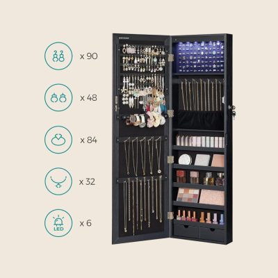 Fali ékszerszekrény, tükrös szekrény 6 led izzóval, fekete