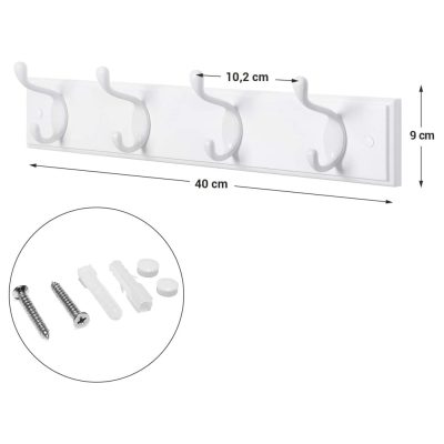 Falra szerelhető ruhatartó 4 fém kampóval, 40 x 7 x 9 cm, fehér |