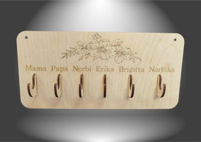 Tedd személyessé otthonod bejáratát egy egyedi, gravírozott fali kulcstartóval, melyre családtagjaid neveit vagy akár kedves üzenetet is kérhetsz! Ez a praktikus és dekoratív kulcstartó nemcsak segít rendben tartani a kulcsokat, de stílusos kiegészítője is lesz az előszobának. Kiváló minőségű fa alapanyagból készül, precíz lézergravírozással. Ideális választás lakásavatóra, családi ajándéknak, házassági évfordulóra vagy bármilyen különleges alkalomra. Az egyedi név gravírozásnak köszönhetően minden darab megismételhetetlen. Rendeld meg online, egyszerűen és gyorsan, és lepd meg szeretteidet egy igazán személyes otthoni kiegészítővel!