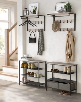 • 【Nagy teherbírás】 Acélból és forgácslapból készült, a fogaspolc 8,4 kg-ot bír el a polcon, 2,3 kg-ot minden egyes akasztón, és 10 kg-ot a ruhatartó rúdon.