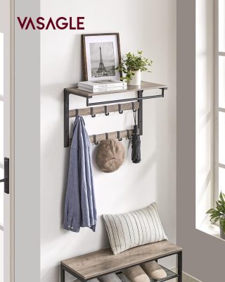 • 【Levehető akasztók】 A falipolcon található 10 levehető akasztó 2 sorban lehetővé teszi, hogy az akasztók közötti távolságot beállítsa, így különböző méretű táskák, ruhák és egyéb tárgyak akaszthatók rájuk.