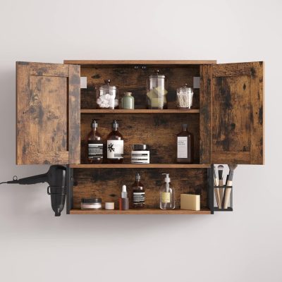 Fali szekrény, fürdőszobai szekrény, 2 ajtós szekrény állítható polccal, hajszárító tartó, hálós kefetartó, ipari stílusú, rusztikus barna és fekete: