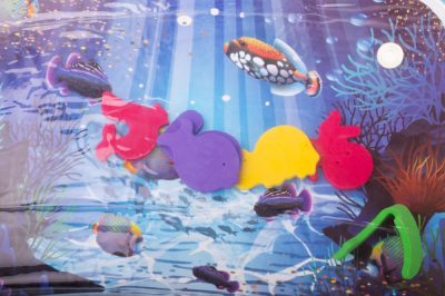 A szőnyeg belsejében színes vízi állatok vannak, amelyek a gyermek mozgásának hatására mozognak.