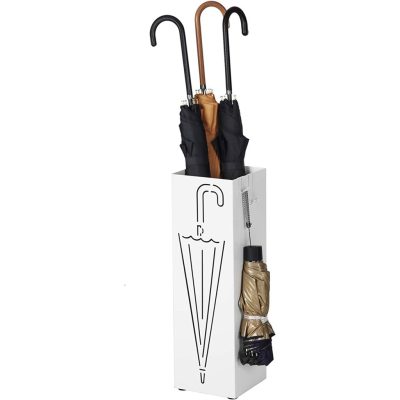 fém esernyőtartó, négyzet alakú esernyőtartó, kivehető víztálca, kampóval, 15,5 x 15,5 x 49 cm, fehér: