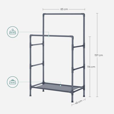 Fém ruhaállvány 2 ruhatartóval, 1 polccal, maximális teherbírás 55 kg, könnyen összeszerelhető, szürke: