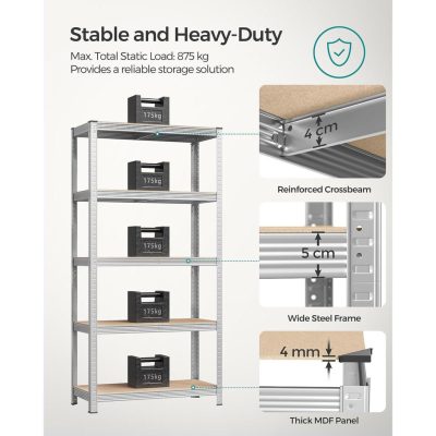 garázspolcok, 5 szintes tárolóállványok, 2 db-os készlet, 180 x 90 x 40 cm, max. Terhelhetőség 875 kg (175 kg rétegenként), polcok, állítható polcok, megerősített acélváz, ezüst: