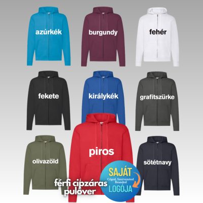 Kényelmes pamut cipzáras pulóver zsebbekel és kapucnival 9 színben, tartós emblémázással.