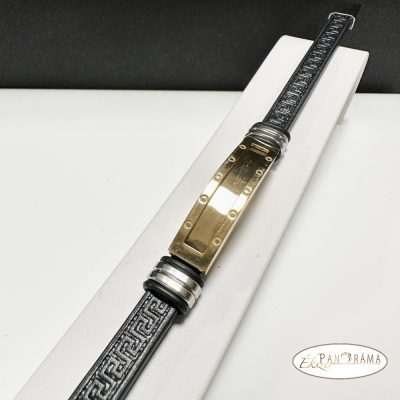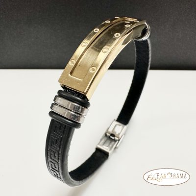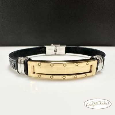 Nemesacél férfi karkötő bőr kombinációval, arany színű fémrésszel, szíja görög mintás bőr díszítéssel! Igazán fiatalos, férfias, sportos viselet.