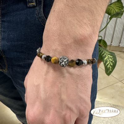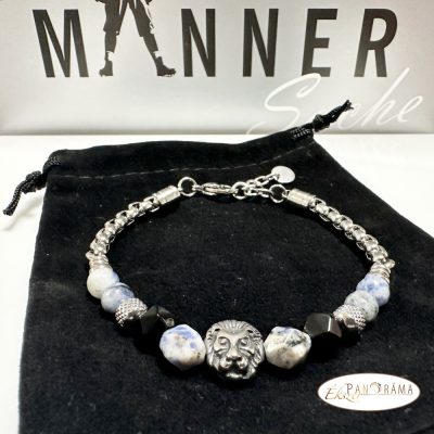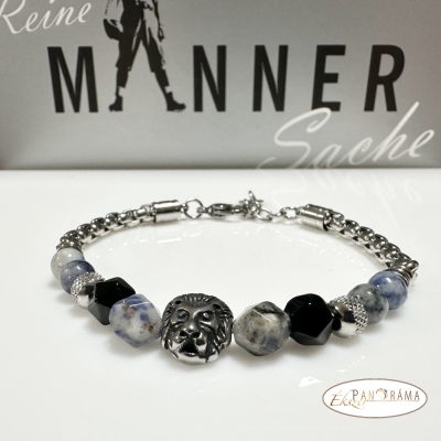 Nemesacél karkötő, szodalit, ónix ásványokkal, közepén egy acél oroszlán fejjel