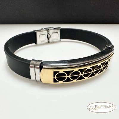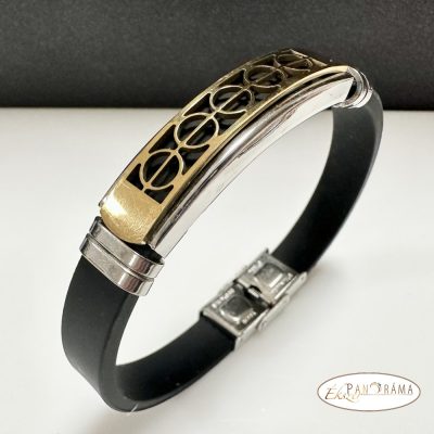 Nemesacél férfi karkötő kaucsuk kombinációval, aranyozott díszítéssel. Igazán fiatalos, férfias, sportos viselet.