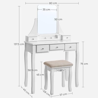 • Amit kap: Fésülködő asztal előre összeszerelt fiókokkal, tükör, párnázott szék, szerelőkészlet, illusztrált útmutatók, professzionális ügyfélszolgálat és elégedettségi garancia