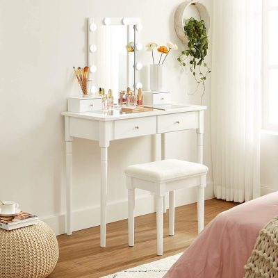 • Fésülködőasztal szett, öltözőasztal párnázott székkel és 10 állítható fényerősségű lámpával, 90 x 133,5 x 40 cm, fehér
