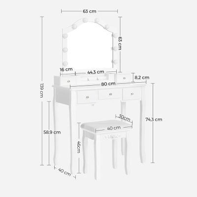 • A fésülködőasztal mérete: 80 x 139 x 40 cm