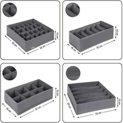 • Változatos felépítés: 4 részes szövetdobozok megfelelnek az Ön különböző tárolási igényeinek, 5 cellás rendszerezővel (32 x 32 x 10 cm) a melltartókhoz, 6 cellás (32 x 16 x 10 cm) az alsóneműkhöz, 8 cellás (32) x 16 x 10 cm) nyakkendőhöz és 24 cellás (32 x 32 x 10 cm) zoknihoz