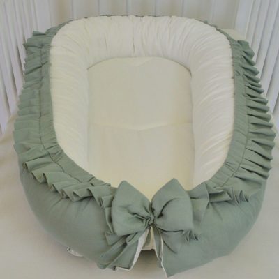 A babafészek peremét egy bújtatóházcsík díszíti, amiben a befűzött összehúzószalag segítségével a fészek méretre igazítható.