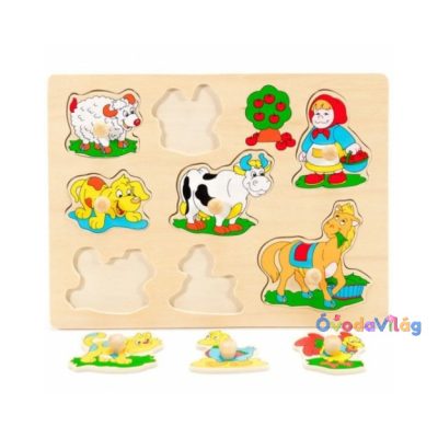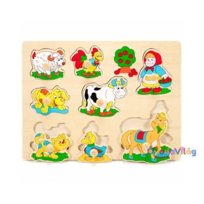 Fogantyús fa kirakójáték - A ház körül a puzzle táblán láthatóak állatok színes ábrái, mellyel könnyen be tudja azonosítani gyermeke a puzzle helyét. Kiváló kikapcsolódást nyújt a gyermekek számára és elősegíti a szem-kéz koordinációs készség valamint a vizuális észlelés képességének fejlődését.