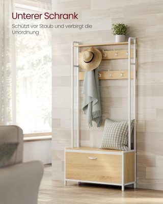 • [Multifunkciós fogas]: 9 akasztóval, cipőszekrénnyel, 85 cm széles paddal és felső polccal ez az előszobabútor lehetővé teszi a kabátok felakasztását, a cipők rendszerezését, a leülést cipőcseréhez, valamint kedvenc dísztárgyaid kihelyezését