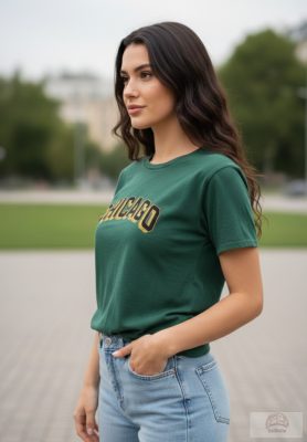 Stílusos Megjelenés: Az elejét díszítő, íves "CHICAGO" felirat sötétkék alapon arany csillámos (glitter) kontúrral készült, amely különleges textúrát és fényt ad a pólónak.