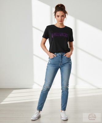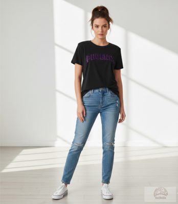 Grafika: A mellkason egy íves, nagyméretű "PHOENIX" felirat látható. A betűk látványos, csillogó lila (glitteres) kitöltést és fekete 3D-s árnyékolást kaptak, ami mélységet ad a mintának.