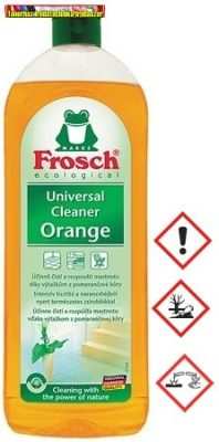 A Frosch narancsos univerzális tisztítószer kitűnően eltávolítja a zsíros szennyeződéseket. Használható padlón, a konyhában vagy minden lemosható felületen. Az univerzális narancs illatú tisztító természetes narancshéjból nyert zsíroldókkal takarít, mely kellemes illattal párosul.