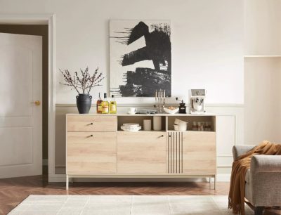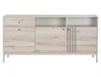 A komód három részre osztott kialakítása maximális tárolási rugalmasságot nyújt. A fiókos, ajtós és nyitott polcos részek lehetővé teszik a különböző típusú tárgyak rendszerezett tárolását, miközben a dekoratív elemek elhelyezésére is lehetőséget biztosít.