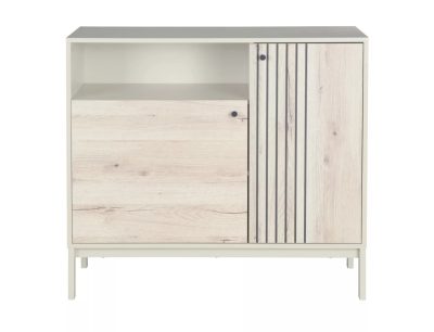 A bútor praktikus kialakítása lehetővé teszi a rendezett tárolást, miközben a csíkos mintázatú ajtó és a minimalista fogantyúk különleges karaktert adnak a darabnak. Az erős fémváz stabil alapot biztosít, így hosszú évekig megbízható tárolóbútorként szolgál.