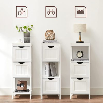 A nagy fiókkapacitásnak köszönhetően tárolhatja a szükséges szappanokat, törölközőket és egyebeket.A több polcterület biztosítása érdekében az opcionális fiókok könnyedén eltávolíthatók.A sima, fehér festék még évekig feldobja fürdőszobáját.