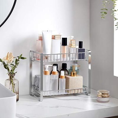 fűszertartó, 2 szintes fém konyhapolc, fűszerrendező műanyag polcbéléssel, csúszásmentes lábakkal, könnyen összeszerelhető, munkalapra, kamrába, fürdőszobába, ezüst színben