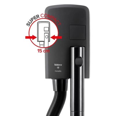 Hotello matt fekete színű gégecsöves hajszárító. ABS ház, 147 x 238mm kompakt, automatikus bekapcsolás kézbevételnél, 8 perces biztonsági kapcsoló, kihúzható gégecső egészen 1,20m-ig, fix és dugvillás bekötés, IP 34 fokozat. Borotválkozó dugaljas.