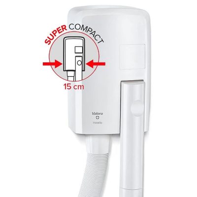 Hotello fehér színű gégecsöves hajszárító. ABS ház, 147 x 238mm kompakt, automatikus bekapcsolás kézbevételnél, 8 perces biztonsági kapcsoló, kihúzható gégecső egészen 1,20m-ig, fix és dugvillás bekötés, IP 34 fokozat.
