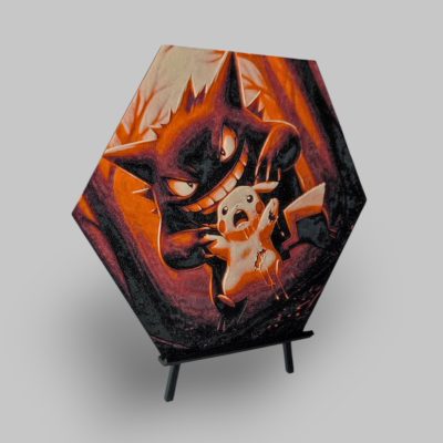 Lépjen be a Pokémon világba ezzel a hatszögletű Hueforge képpel, amely a szellemtípusú Gengart és az elektromos típusú Pikachut ábrázolja egy dinamikus és izgalmas kompozícióban.