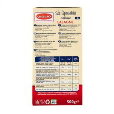 A GIGLIO "Lasagne" lasagne 500 g-os tészta kiváló minőségű olasz tészta, amelyet tojás hozzáadása nélkül készítenek. Ez a termék ideális választás klasszikus lasagne készítéséhez, rugalmasságot és könnyű elkészítést kínál, így az otthoni szakácsok és a szakemberek körében egyaránt kedvelt választás. A tésztalapok a lasagne hagyományos és vegetáriánus változatához egyaránt használhatók.