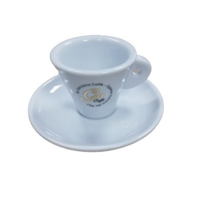 Elegáns fehér espresso készlet, a csészén arany Go felirattal.