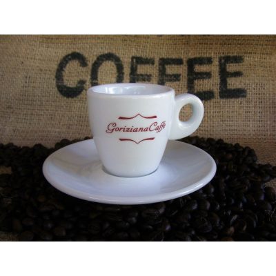 Hosszúkás vastagfalú eszpresszós csésze mindkét oldalon Goriziana logóval.
