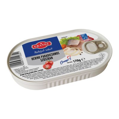 hering 60% (Clupea harengus FA0 27-Fogás helye: Atlanti-óceán északkeltei része), paradicsomszósz 40% (ivóvíz, paradicsomsűrítmény, cukor, módosított kukoricakeményítő, ételecet, étkezési só, repceolaj, szárított vöröshagyma, borskivonat, sűrítőanyag: guargumi).