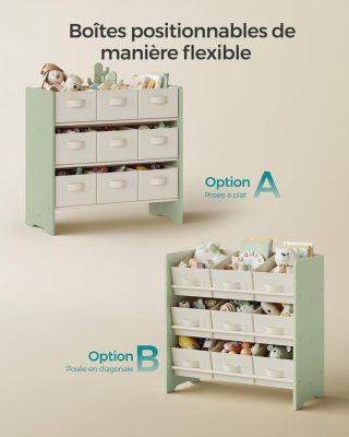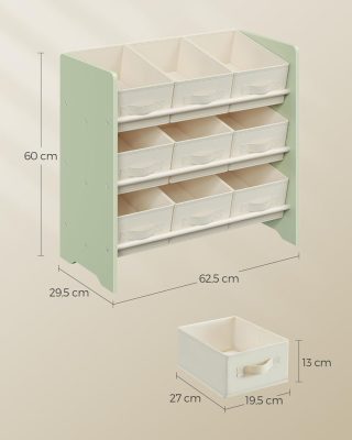• Gyerek játéktároló polc, 9 szövet tárolódobozzal, 29,5 x 62,5 x 60 cm, babér zöld