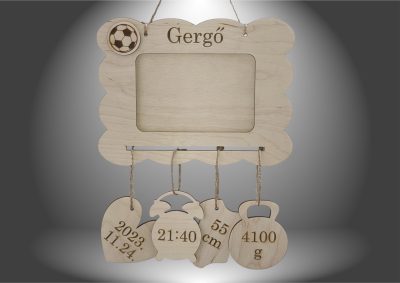 Különleges és személyes ajándék babaszületésre vagy keresztelőre: lézervágott fa gyerek képkeret, amely 10×15 cm-es fényképet foglal magába. A keret alján négy apró motívum lóg – mindegyiken a baba születési adatai szerepelnek, mint a dátum, időpont, súly és hossz. A természetes fa melegsége és a precíz lézervágás egyedi, kézműves hangulatot ad a keretnek. Tökéletes választás a babaszoba dekorációjához vagy megható ajándéknak a nagyszülőknek. Könnyen falra akasztható, így mindig szem előtt tartható a különleges pillanat. Személyre szabható kivitelben rendelhető, hogy örök emlék maradjon a legelső közös fotóval együtt.