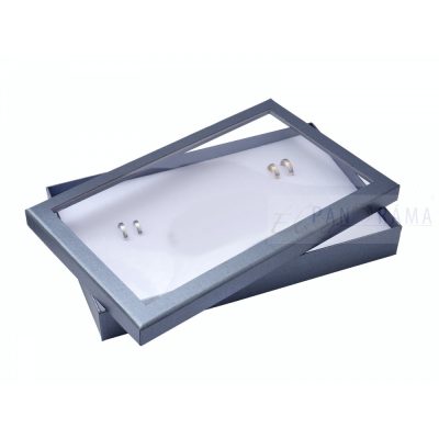 Gyűrűk, fülbevalók tárolására alkalmas doboz, átlátszó, vitrines tetővel.
