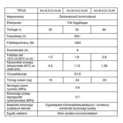 A Slim sorozatban több űrtartalom is elérhető (30 l, 50 l, 80 l), de az egyik leggyakrabban vásárolt típus a 80 literes. Ez a méret lehetővé teszi, hogy egyszerre több vízvételi helyet is ellásson, például zuhanyzót és mosdót egyszerre. A kezelése egyszerű: beépített tekerőgombos hőmérsékletszabályzó és termikus biztonsági túlmelegedés elleni védelem található benne. A tartályra 5 év, az egyéb részegységekre 2 év garancia jár.