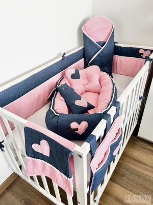 A Harper Rose teljes babaágy szett a romantikus rózsaszín kockás mintát ötvözi a modern farmerhatású pamuttal és a játékos bogyós díszítésekkel. Ez a 7 részes szett harmónikusan illeszkedik a babaszobába, miközben biztosítja a baba komfortját és védelmét.