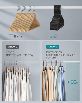 • Okos kialakítás: a szélesebb vállbevágásokkal a vállfák ideálisak a pántos ruhák felakasztására. Ezenkívül a vállrész csúszásmentes kialakítása növeli a súrlódást és megakadályozza a ruhák elcsúszását