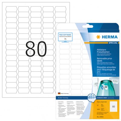 Herma No. 10002 fehér színű 35,6 x 16,9 mm méretű, univerzálisan nyomtatható, öntapadós árazó címke, visszaszedhető ragasztóval A4-es íven - kiszerelés: 2000 címke / 25 ív