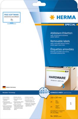Herma No. 10021 fehér színű 210 x 297 mm méretű, univerzálisan nyomtatható, öntapadós etikett címke, visszaszedhető ragasztóval A4-es íven - kiszerelés: 25 címke / 25 ív