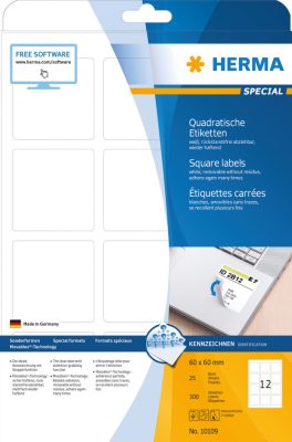 Herma No. 10109 fehér színű 60 x 60 mm méretű, univerzálisan nyomtatható, négyzet alakú öntapadós etikett címke, visszaszedhető ragasztóval A4-es íven - kiszerelés: 300 címke / 25 ív