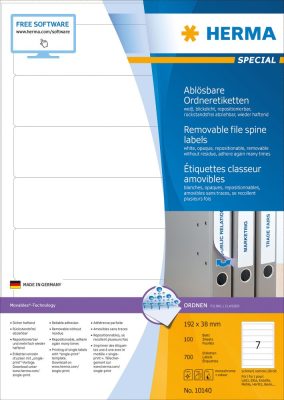 • Herma No. 10140 univerzális 192 x 38 mm méretű, visszaszedhető fehér öntapadó iratrendező címke A4-es íven - 700 iratrendező címke / doboz - 100 ív / doboz (Herma 10140)