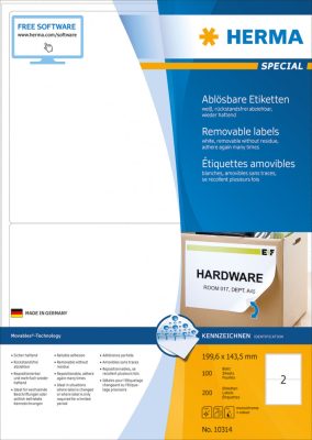 Herma No. 10314 fehér színű 199,6 x 143,5 mm méretű, univerzálisan nyomtatható, öntapadós etikett címke, visszaszedhető ragasztóval A4-es íven - kiszerelés: 200 címke / 100 ív