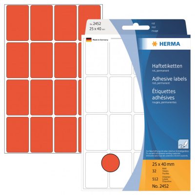 • Herma No. 2452 piros színű 25 x 40 mm méretű, kézzel írható, öntapadó etikett címke, általános felhasználásra, permanens ragasztóval - kiszerelés: 512 címke / csomag