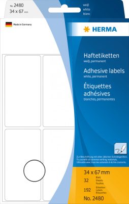 Herma No. 2480 fehér színű 34 x 67 mm méretű, kézzel írható, öntapadó etikett címke, általános felhasználásra, permanens ragasztóval - kiszerelés: 192 címke / csomag